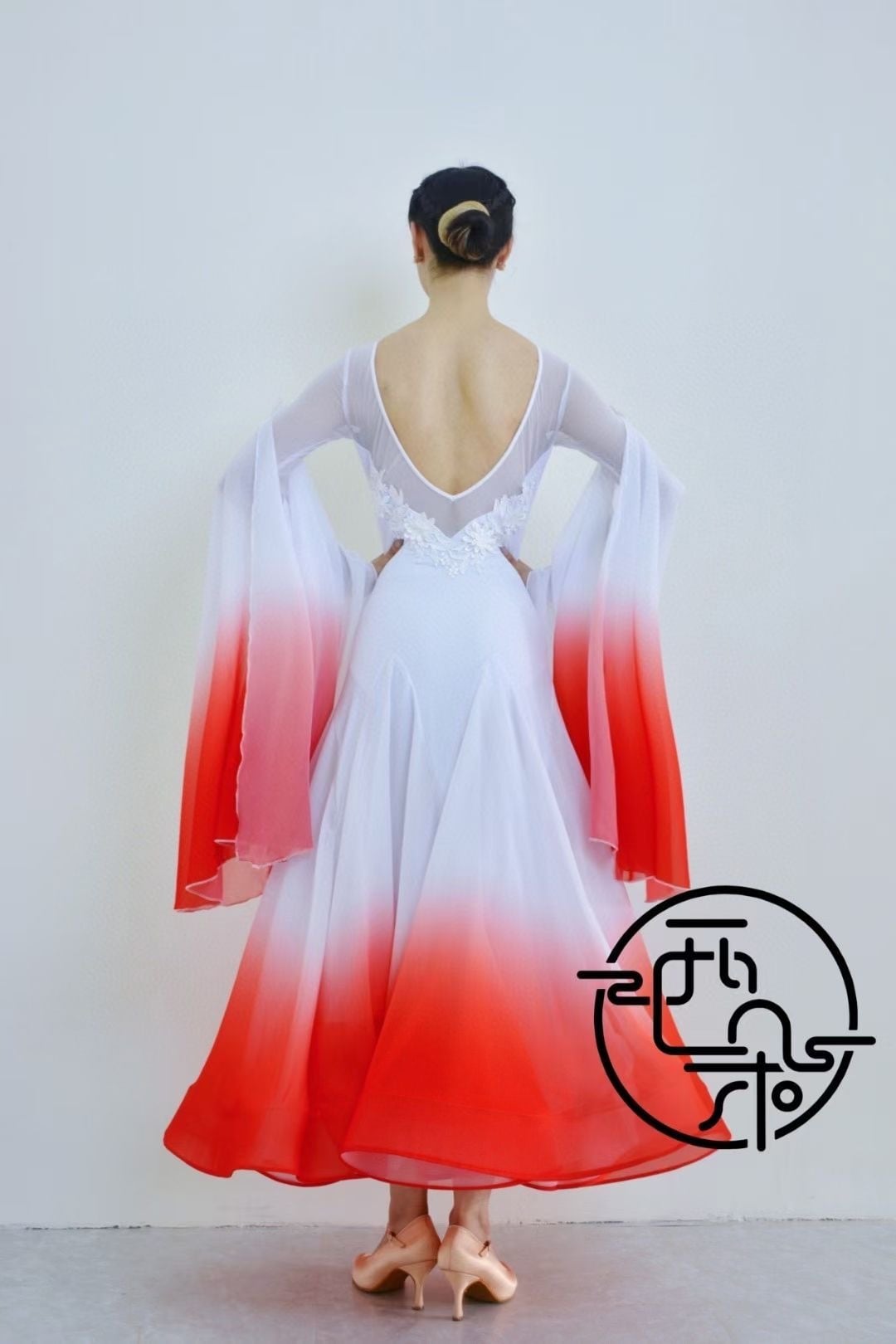 白から紅のグラデーションが美しい、ダンス用ワンピースです。ボディは肌にしっかりフィットし、動きやすさも抜群です。さらに、ワンピースの下部には大きなフロートがついているので、踊る度に美しいシルエットを演出することができます。パフォーマンスが光る一着ですので、舞台やイベントで主役級の存在感を放ちたい方にぴったりです。